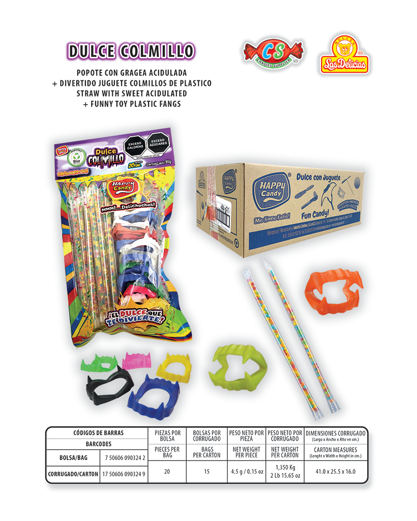 Popote con Gragea Acidulada y Colmillos de Plastico Con 20 Pzas. por Bolsa